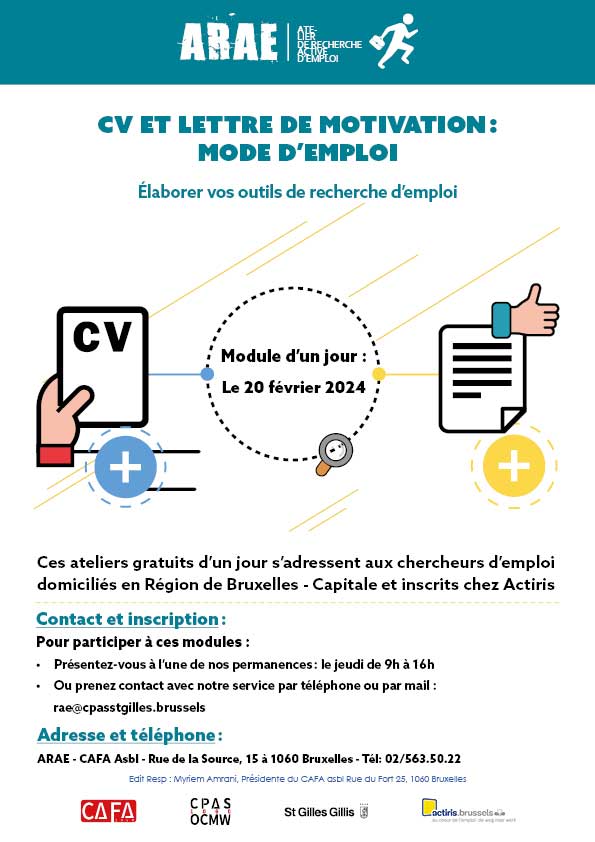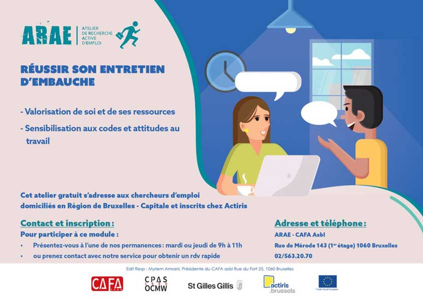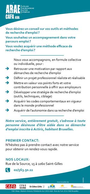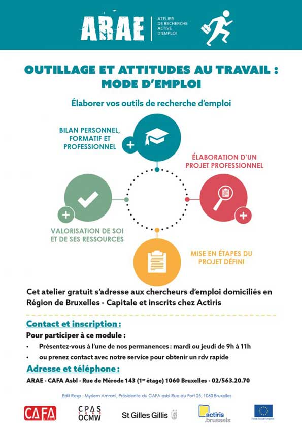Situé au sein de la Maison de l’Emploi de Saint-Gilles, le dispositif ARAE propose un accompagnement collectif et individuel, principalement en matière de soutien et d’aide à la recherche d’emploi des demandeurs inscrits auprès d’Actiris.