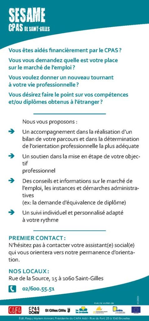 Prendre contact avec votre assistant(e) social(e) du CPAS qui vous orientera vers notre permanence d’orientation.
